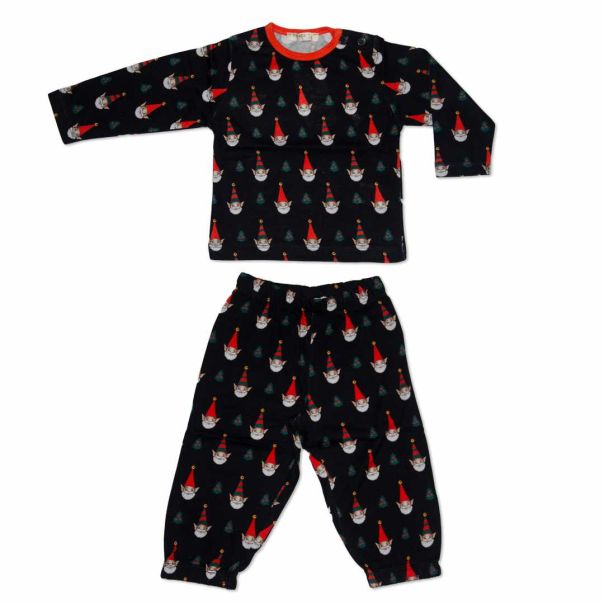 Dvodelna pidžama . Gornji deo sa okruglim izrezom i dugim rukavima. Dva dugmića na ramenu. Donji deo sa elastičnim pojasom i rubovima. Motiv Deda Mraza celom površinom.