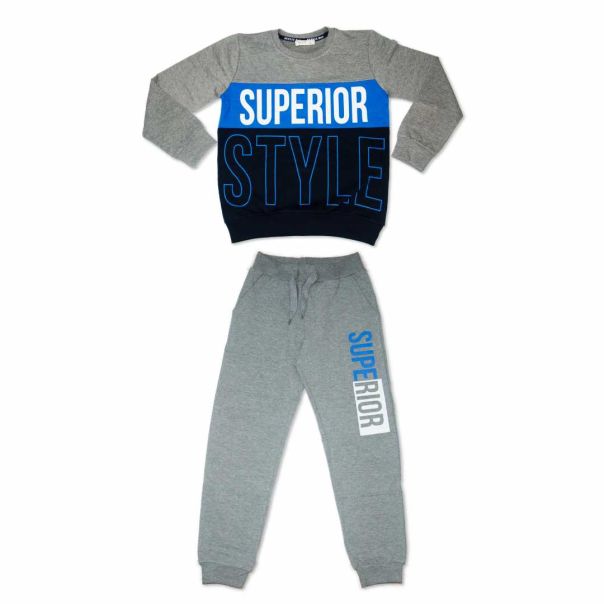 Dvodelni komplet. Gorni deo sa okruglim izrezom, dugim rukavima, rastegljivim rubovima i tekstualnim sloganom na prednjoj strani. Donji deo sa elastičnim pojasom, tekstualnim sloganom i elastičnim rubovima.