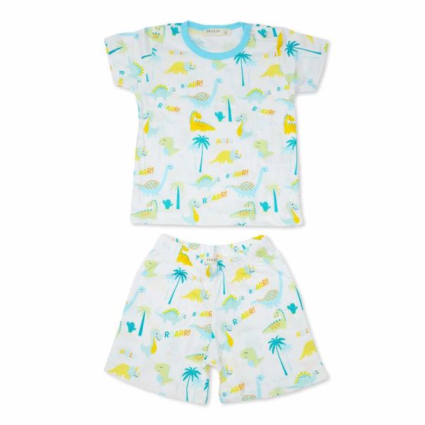Dvodelni komplet. Majica sa okruglim izrezom i kratkim rukavima. Kopčanje dugmićima na ramenu. Donji deo sa elastičnim pojasom i kratkim nogavicama. Motiv dinosaurusa celom površinom.