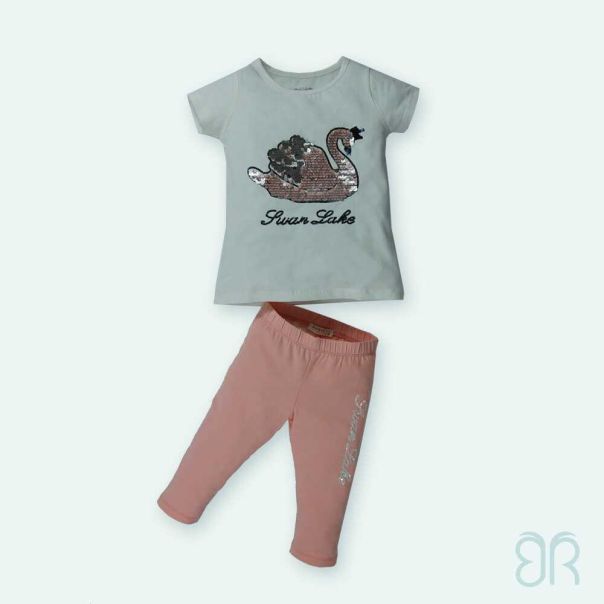 Dvodelni komplet. Majica sa okruglim izrezom, helanke 3/4. Majica sa motivom labuda našivenim od štrasa.