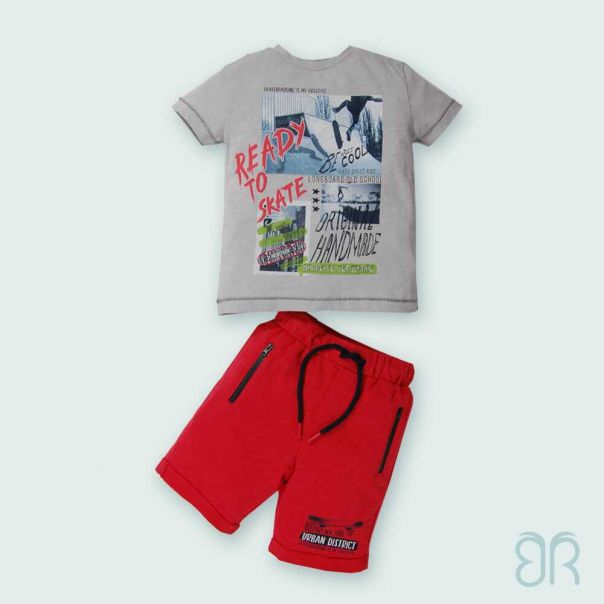 Dvodelni komplet. Majica sa kratkim rukavima i okruglim izrezom ,sa printom READY TO SKATE. Jednobojnim sorcem sa printom na dnu nogavice.