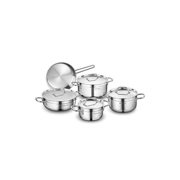 Set posudja od nerđajuceg celika 9 delova. Dimenzije / zapremina: 16 x 9 cm / 1,8 L, 20 x 11 / 2,7 L, 24 x 8 cm/ 3,5 L, 24 x 12cm / 3,5, tiganj: 24 x 6 cm