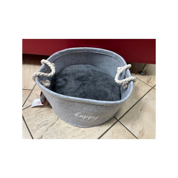 Platnena korpa za mačku, sive boje, sa ručkama za nošenje, dimenzije 40cm x 18 cm, unutra je jastuk, mekan i topao