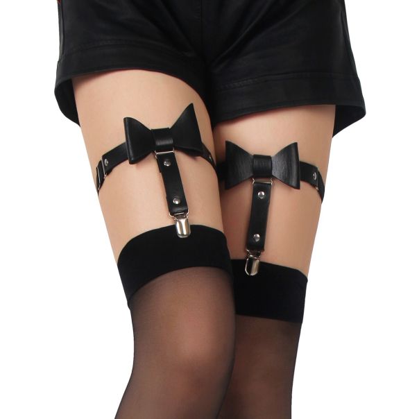Ova crna punk podvezica od eko-kože sa nitnama i centralnom mašnom u obliku leptira dodaje edgy i zavodljiv detalj vašem izgledu. Podesivi elastični kaiš se lako prilagođava različitim veličinama butina, dok dve halter trake sprečavaju klizanje. Nerđajući čelični metalni kaiševi pružaju luksuzan i izdržljiv završni detalj.