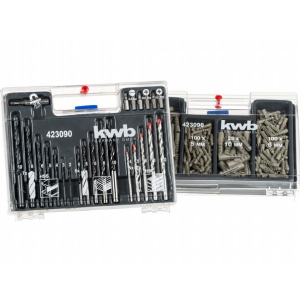 | KWB 49423090 osobine i prednosti | U praktičnoj plastičnoj kutiji. Burgije za drvo, metal i kamen, bitovi, nosač bitova i plastični tiplovi. |