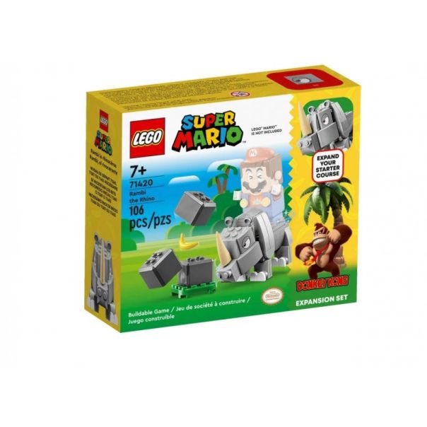 Spremi se za LEGO Super Mario avanture uz pomoć kompleta za proširenje Nosorog Rambi (71420), za decu uzrasta 7+. Sadrži LEGO figuru igračku Rambija od kocki, na kojoj se mogu provozati interaktivne figure LEGO Mario, LEGO Luiđi ili LEGO Breskvica (nisu priložene). Kada Rambi hoda, zaleće se u priložene elemente kamenja koji mogu da se slažu ili obavlja druge pokrete – aktiviraju se zvučni efekti u interaktivnoj figuri. Napomena: za interaktivnu igru je potreban Početni nivo 71360, 71387 ili 71403.