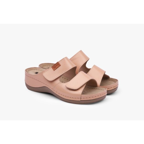Ženska papuča izrađena od prirodne kože i kožnom tabanicom koja sadrži masažni gel. Đon je naparvljen od poliuretanske mase koji sadrži anti – slip čep koji sprečava klizanje. Gornjište sadrži čičak traku za podešavanje