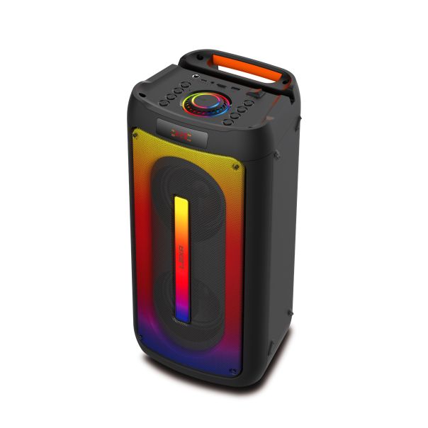 Bluetooth karaoke prenosni sistem/ jacina 300 W/ ugradjen FM radio/ podrzava reprodukciju preko bluetooth-a , USB memorije i micro SD kartice/ podrska AUX in/ 1x žičani mikrofon/ mocan 2 x 4" BASS niskotonski zvucnik/ LED displej sa crvenim osvetljenjem/ rucica za laksi prenos uredjaja/ ugradjena punjiva baterija od 3.7 V/ dimenzije:213x195x425