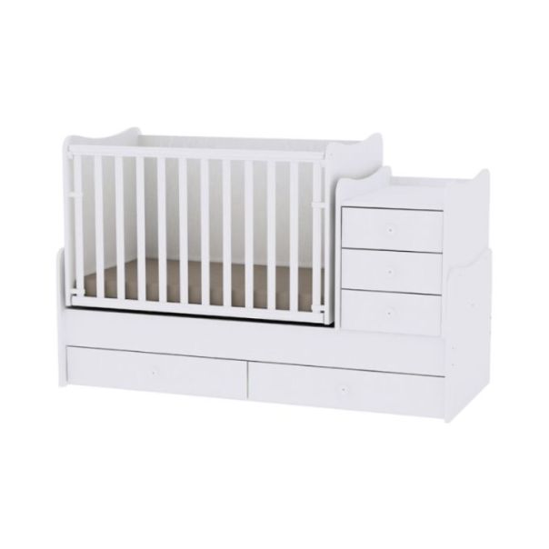 Sastoji se iz tri dela koji čine jednu celinu (kolevka, krevetac za odraslo dete i ormarić). Krevetac je napravljen od visoko kvalitetne 18 milimetarske melaminske iverice. Unutrašnje dimenzije kolevke: 110 x 63 cm. Ogradica na kolevci od visoko kvalitetne plastike sa mogućnošću spuštanja. Unutrašnje dimenzije: 162 x 63cm- Mogućnost podešavanja zadnje stranice kreveta- 2 velike fioke. Mogućnost fiksiranja kolevke. Ormarić sa plastičnim nogicama ima 3 fioke. 3 položaja nosača dušeka. Ormarić sa 3 fioke i nosačem za mekanu podlogu za prepovijanje (može se podesiti sa leve i sa desne strane).