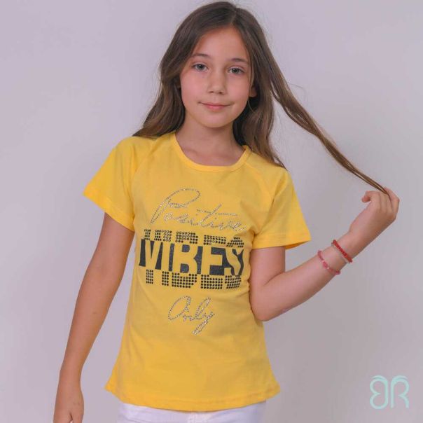 Majica sa kratkim rukavima i okruglim izrezom.Dezen sa tekstualnim sloganom i cirkonima na prednjoj strani.