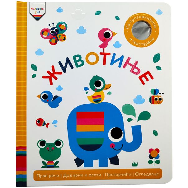 U ovoj knjizi pronaći ćete mnoštvo šarenih i krupnih ilustracija, različite teksture, prozorčiće i ogledalce, pa će tako mališani stimulisati svoja čula dok uče prve reči.