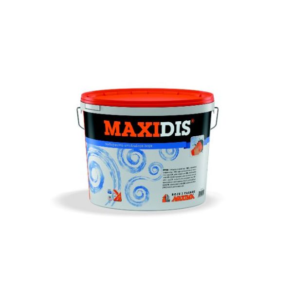 Primena: Namenjena je za zaštitu i dekoraciju unutrašnjih zidnih površina od: betona, produženog maltera, gasbetona, azbest-cementa, iverice. Proizvodi se kao bela i kao baza na nijansiranje na maxima mix sistemu. Maxidis se može tonirati maxi color-om, do pastelnih nijansi ili maxifas color-om prema ton karti „boje i malteri“, kao i na maxima mix sistemu. Šifra: 5-D-04852. Težina pakovanja: 15l. Jedinica mere: kom. Način primene: Podloga na koju se nanosi maxidis mora biti: tvrda, suva, čista i bez slabo vezanih delova, prašine, vodorastvornih soli, masti i ostalih nečistoća. Staru boju koja nije dobro vezana, mehanički odstraniti, a neravne površine izgletovati Pre nanošenja maxidis boje, zidove impregnirati maxikril podlogom. Nanošenje maxidis-a vršiti u dva pokrivna sloja. Drugi premaz ide na prethodno osušeni sloj.