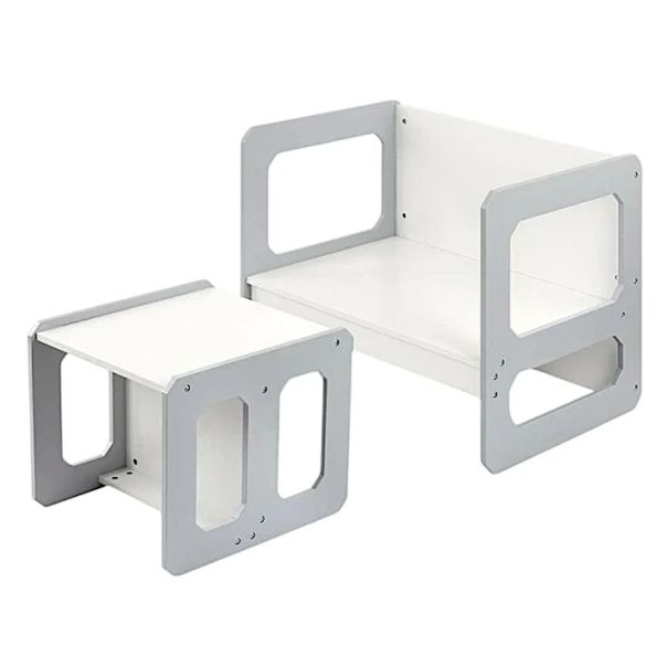 Montesori dečiji sto i stolica KINDER HOME, drveni set 3 u 1, bela i siva je elegantno i praktično rešenje za svaku dečiju sobu. Ovaj multifunkcionalni set praktično kombinuje sto i stolicu, klupu i pomoćni stočić, uz očuvanje funkcionalnosti, stila i bezbednosti. Kreiran prema Montesori principima, set podstiče samostalnost, organizovanost i kreativno razmišljanje deteta, a istovremeno je deo kvalitetnog dečijeg nameštaja.