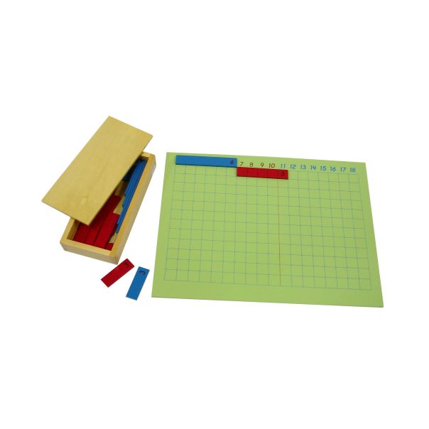 Set sadrži tablu podeljenu na 12 redova i 18 kolona obeleženim brojevima 1 - 18, kutiju sa 18 drvenih traka/štapova - 9 crvenih i 9 plavih, obeleženih brojevima 1 - 9. Rad sa ovim materijalom pruža detetu priliku da vežba matematičku operaciju sabiranja, postepeno i po nivoima, usvaja nove pojmove, vežba memoriju...