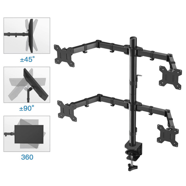 Nosač za četiri monitora štedi prostor na vašem stolu, a istovremeno dobijate ergonomski radni položaj. Potpuno je pokretan pa ćete sa lakoćom pronaći položaj koji vam najviše odgovara. Mogućnost rotacije za 360 stepeni vam omogućava da monitore postavite horizontalno ali i vertikalno a sve po potrebi i nameni. Ovaj nosač je izrađen od visokokvalitetnih materijala koji garantuju čvrstoću i sigurnost vaših monitora. Sa čvrstim nosačima i prilagodljivim sistemom postavljanja, možete lako podešavati visinu, nagib i ugao svakog monitora kako biste postigli optimalan položaj za udoban rad. Nosač za četiri monitora omogućava vam da organizujete svoje monitore na način koji vam najviše odgovara. Možete ih postaviti jedan pored drugog, u red ili u krug, pružajući vam široki pregled vašeg radnog prostora. To vam omogućava da istovremeno pratite više informacija, multitaskujete efikasnije i poboljšate produktivnost. Osim organizacije, ovaj nosač takođe pomaže u smanjenju zamora očiju i vrata. Podešavanjem monitora na odgovarajući nivo i ugao, smanjuje se naprezanje očiju i minimizira neudobnost tokom dugih radnih sati. Osećajte se udobno i fokusirano dok obavljate svoje zadatke. Nosač za četiri monitora je jednostavan za instalaciju i kompatibilan sa različitim veličinama monitora. Bilo da koristite 22-inčne ili 27-inčne monitore, ovaj nosač će pružiti sigurno i stabilno postavljanje. Takođe, ima integrisani sistem upravljanja kablovima koji pomaže u održavanju urednog i organizovanog radnog prostora. Organizujte svoje radno okruženje na efikasan način uz nosač za četiri monitora. Poboljšajte svoju produktivnost, smanjite nered i oslobodite prostor na svom stolu.