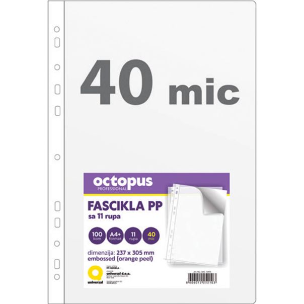Folija A4+ formata je debljine 40 mikrona, sadrži 11 rupa sa strane za odlaganje u fascikle ili registratore. Neprovidna je orange peel. U pakovanju se nalazi 100 folija.