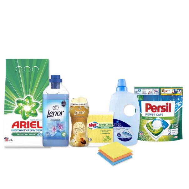 Paket za pranje veša + poklon Trulex krpe: Ovaj paket sadrži pažljivo odabrane proizvode za temeljno i osvežavajuće pranje veša: • Persil kapsule za pranje veša Power Universal 29/1: Efikasne kapsule za pranje koje uklanjaju tvrdokorne mrlje i pružaju besprekornu čistoću. • Ariel prašak 2,25kg Mountain spring: Prašak za pranje veša sa osvežavajućim mirisom planinskog izvora, koji obezbeđuje dubinsko čišćenje. • Lenor 1,625L Spring: Omekšivač za veš koji pruža dugotrajnu svežinu i mekoću odeći. • Voda za peglu 1L Koncentrat Felce Azzura: Koncentrisana voda za peglanje koja osigurava glatku i mirisnu tkaninu nakon peglanja. • Lenor mirisne granule 210g Gold: Dodajte dodatnu dozu svežine uz mirisne granule koje se lako dodaju u veš mašinu. • Trulex krpa mala 3/1 (poklon): Set izdržljivih krpa koje su savršene za različite zadatke čišćenja. Ovaj komplet nudi sve što vam je potrebno za sveže, mirisno i besprekorno čisto rublje, uz poklon Trulex krpe kao dodatnu pogodnost!