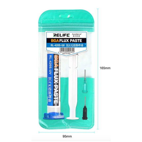 Specifikacija: Brend: Relife Model: RL-420S-UV Kapacitet: 10CC Karakteristike: Uvezena smola, bez virtualnog lemljenja, lako za lemljenje. Boja je čista, bez primesa. Brzo teče lemljenje i ima manje dima. Visok izolacioni otpor, pogodan za popravku mobilnih telefona PCB, CPU. To je mešavina visokokvalitetnog legiranog praha i smolastog pastoznog fluksa. Pomaže u popravci ploča i štiti elektronske komponente. Neophodan materijal za popravku matične ploče mobilnog telefona. Paket sadrži: 1 kom x RL-420S-UV pasta za fluks
