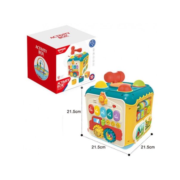 Karakteristike Interaktivna kocka sadrži 8 različitih igara koje se nalaze na svakoj pojedinačnoj strani lavirint, loptice i čekić, muzičku igru sa dugmićima i označenim notama, točak sa kazaljkama na kome su prikazana