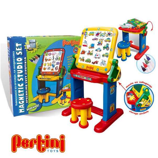 Pertini Magnetic studio-saobraćaj razvija kreativnost, opažanje, organizacione sposobnosti i edukuje decu na temu saobraćaja. Po tabli se piše flomasterima koji se lako brišu. Set sadrži tablu za crtanje / stočić, magnete saobracaj -20kom,stoličicu, flomaster, sunđer.