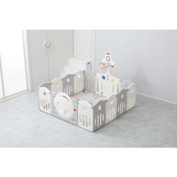 Ogradica 'Raketa' u sivo beloj boji, dimenzija 200x160 cm i visine 63 cm, je pravi mali svet za vaše najmlađe – mesto gde mogu slobodno, bezbedno i srećno da se igraju, istražuju i razvijaju svoje veštine. Zahvaljujući 14 čvrstih panela, uključujući jedan panel za igru, kao i vrata i koš za košarku, ova ogradica otvara beskrajne mogućnosti za neograničenu igru i avanturu. Sa pažljivo odabranim dizajnom koji odiše toplinom i sigurnošću, ova ogradica postaje srce svake dečje sobe, vrtića ili igrališta, stimulišući maštu i kreativnost mališana dok se igraju, skakuću i trče. Njena stabilna i čvrsta konstrukcija omogućava sigurnost svakog trenutka, a istovremeno pruža dovoljno prostora za njihova najdivnija i najzdravija istraživanja. Izrađena od visokokvalitetnih, sigurnih HDPE materijala koji se koriste u prehrambenoj industriji, garantuje dugotrajnost, otpornost i najviši nivo bezbednosti. Bez brige o zdravlju i sigurnosti, roditelji mogu da uživaju u svakom trenutku provedenom s decom – znajući da su mališani u sigurnom i podsticajnom prostoru. Napomena: podloga i loptice nisu deo seta – za dodatnu sigurnost preporučuje se korišćenje odgovarajuće podloge ili zaštitnog sloja ispod ogradice. Ova ogradica je više od običnog prostora za igru – to je mesto gde nastaju prve, najlepše uspomene, gde se razvija samopouzdanje i gde se rađaju prijateljstva za ceo život. Uskladite trenutke igre sa sigurnošću, ljubavlju i toplinom – i pružite detetu svet u kome će svaki dan biti nova, smehom ispunjena avantura!