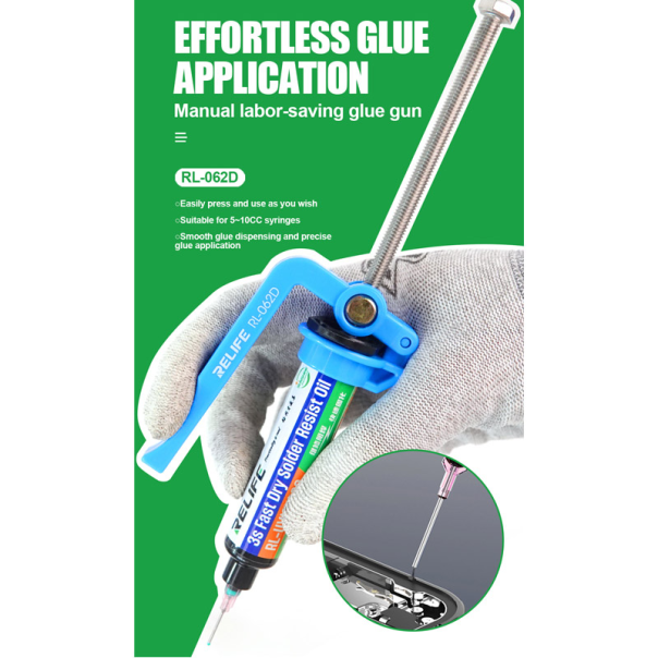 RELIFE RL-062D Ručni plištolj za lepljenje Pogodan za brizgalice od 5~10CC Ergonomski dizajn, udoban za držanje, kompaktan i lagan, glatko doziranje lepka, precizno doziranje lepka i efikasan rad Pokretni deo koristi preciznu metalnu žičanu šipku, koja se pomiče 0,75 mm po rotaciji kako bi precizno kontrolisala količinu lepka. Osnovno telo je napravljeno od inženjerske plastike, koja ima visoku tvrdoću, dobru izdržljivost i dugovečnost.