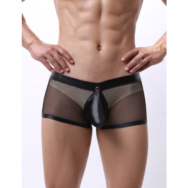 Unesite odvažnost i samopouzdanje u svoj izgled uz ovaj muški bokser donji veš koji kombinuje mrežastu tkaninu i veštačku kožu, sa otvorenim preponama za dodatnu provokaciju.