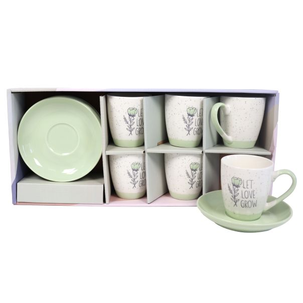 Svaka šoljica iz ovog seta nosi jedinstvenu poruku "Let Love Grow", koja dodaje poseban šarm i toplinu vašem iskustvu ispijanja kafe. Ovaj motiv inspiriše ljubav i rast, čineći svaki trenutak proveden uz kafu posebnim. Dizajn je diskretan, ali upečatljiv, savršeno se uklapajući u svaki enterijer.