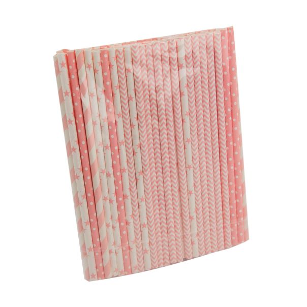 SLAMČICE PAPIRNE su u kombinaciji bele boje sa roza motivima (zvezdice, tufnice ili linije). Papirne slamčice su troslojne dužine 220 mm i prečnika 6 mm. Pakovanje sadrži 100 slamčica.