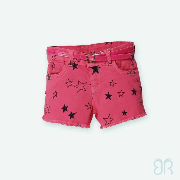Šorc sa džepovima i kaišem. Iskrzani rubovi nogavica i motiv zvezdica po celoj površini.