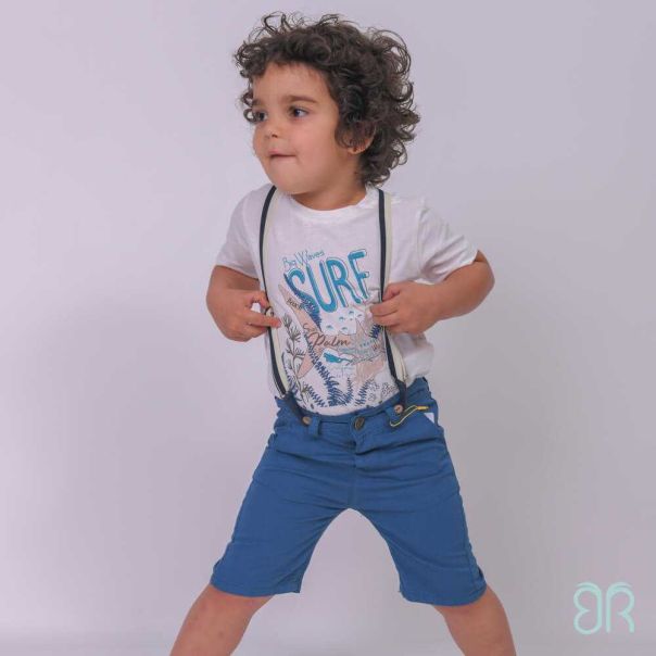 Šorc sa podesivim pojasom sa unutrašnje strane. Kopčanje na dugme sa prednje strane i podesivim tregerima.Sa džepovima i podavijenim rubovima nogavica.