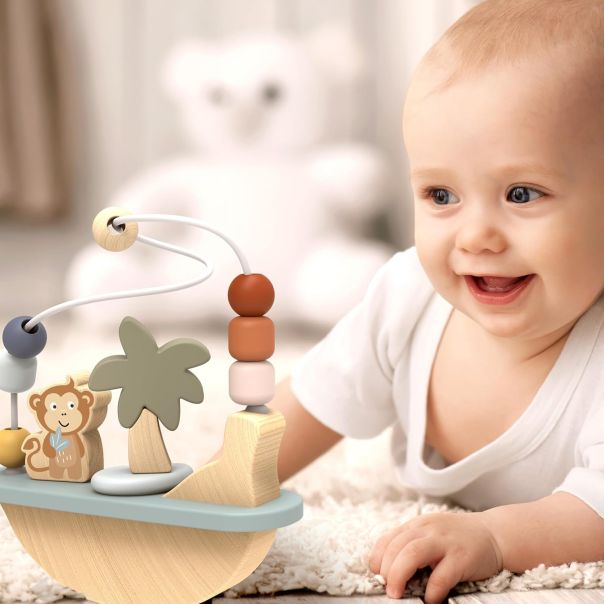 Ovaj lavirint od drvenih perli pastelnih boja nežno se ljulja sa jedne na drugu stranu i okreće se u krug.