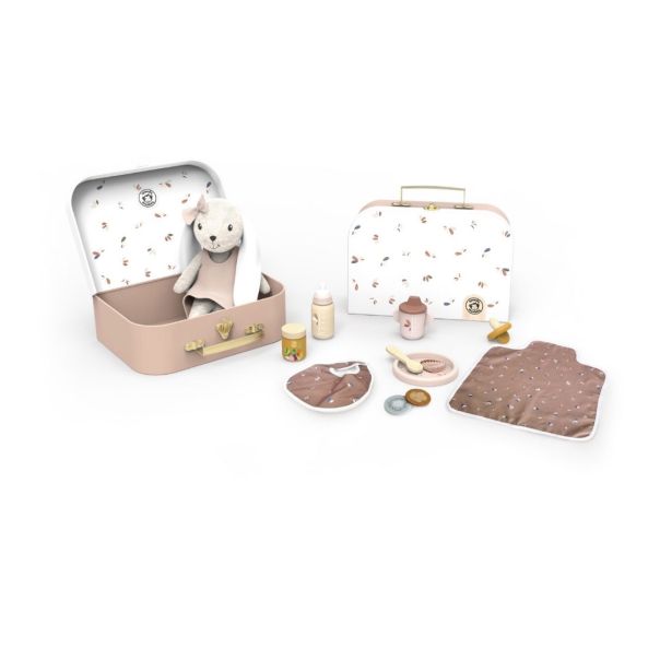 Istražite očaravajući svet maštovite igre uz ovaj set koji uključuje bebu zeca, flašicu za hranjenje, čašu, dodatke za obrok, kašičicu, portiklu, pelene i podlogu za menjanje pelena.