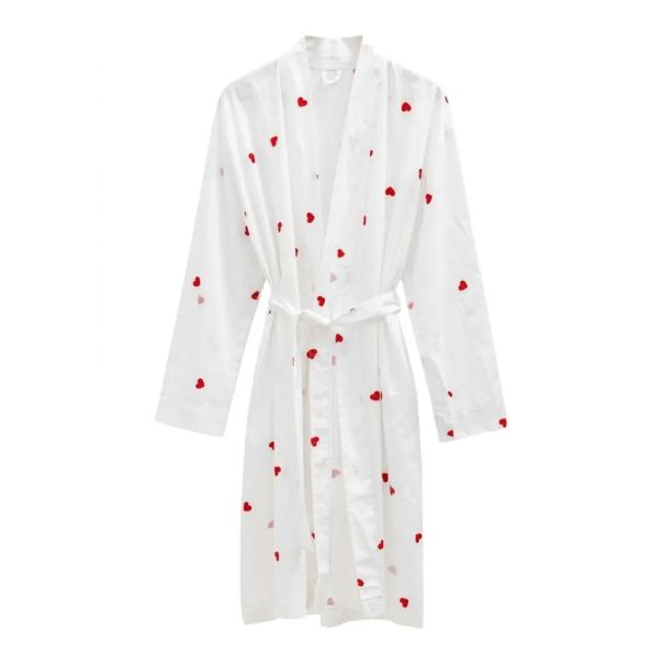 Ogrtač dolazi u prelepom dezenu sa crvenim srcima na beloj podlozi, što mu daje romantičan i sofisticiran izgled. Ovaj dizajn je savršen za one koji žele da unesu malo ljubavi i stila u svoju svakodnevicu. Bez obzira da li ga nosite preko pidžame ili kao dodatak vašem večernjem izgledu, ovaj ogrtač će sigurno privući pažnju.