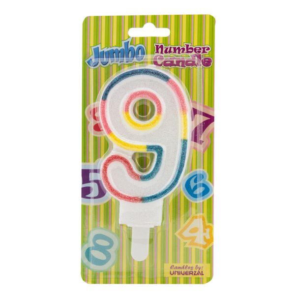 SVEĆA ROĐENDANSKA BROJ 9 JUMBO je bele boje a okvir broja je ukrašen različitim gliter bojama. Nalazi u blister pakovanju. Dimenzija sveće je 12 x 7 cm.