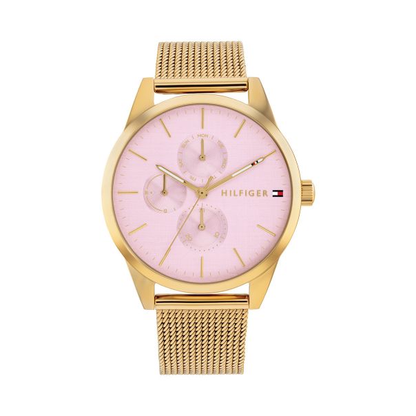 OPIS:Boja brojčanika: Roze;Boja narukvice: Zlatna;Materijal kućišta: Nerđajući čelik;Materijal narukvice: Nerđajući čelik;Oblik kućišta: Okruglo;Prečnik kućišta: 38 mm;Vodootpornost: 3 ATM;Mehanizam: Kvarcni