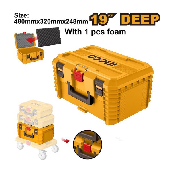 SUPER INGCO transportna kutija za alat od 19″ koja se može slagati je dizajnirana za skladištenje i zaštitu profesionalnih električnih alata i dodatne opreme. Deo je modularnog sistema PRO, koji omogućava slaganje više kutija za alate kako bi se stvorila organizovana, stabilna i lako prenosiva struktura. Idealna je za zanatlije, tehničare i profesionalce kojima je potreban red, čvrstina i brz rad.