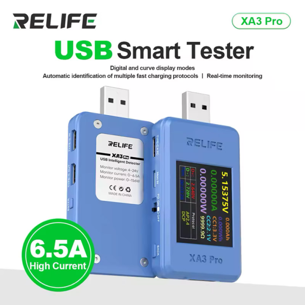RELIFE XA3 Pro – USB Smart Tester Pametno i precizno merenje za sve tvoje uređaje. RELIFE XA3 Pro je profesionalni USB tester koji u realnom vremenu prati napon, struju i snagu, uz podršku za gotovo sve moderne protokole brzog punjenja. Idealno rešenje za testiranje punjača, laptopova, telefona i svih ostalih uređaja. Prednosti: Podrška za fast charging protokole – PD, QC2.0/3.0, SCP, AP2.4A i DCP, za brzo i pouzdano prepoznavanje. Ultra visoka preciznost – rezolucija 0.00001 omogućava uvid u i najmanje promene napona i struje. Merenje visokih struja – do 6.5A, lako testira i zahtevne uređaje. HD ekran od 1.77 inča – pregled više parametara odjednom, sa opcijom rotacije prikaza. Široka primena – testiraj punjače, kablove, telefone, laptopove i sve USB-C digitalne uređaje. Tehničke specifikacije: Rezolucija: 0.00001 Maksimalna struja: 6.5A Ekran: 1.77" HD displej Podržani protokoli: PD, QC2.0, QC3.0, SCP, AP2.4A, DCP