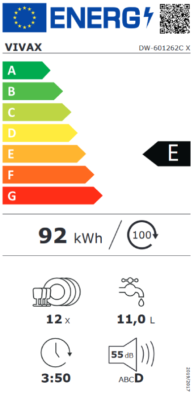 Mašina za pranje sudova ima energetsku efikasnost klase E, što je važno za smanjenje potrošnje energije. Nivo buke iznosi 55 dB, što je prihvatljivo za većinu domaćinstava.