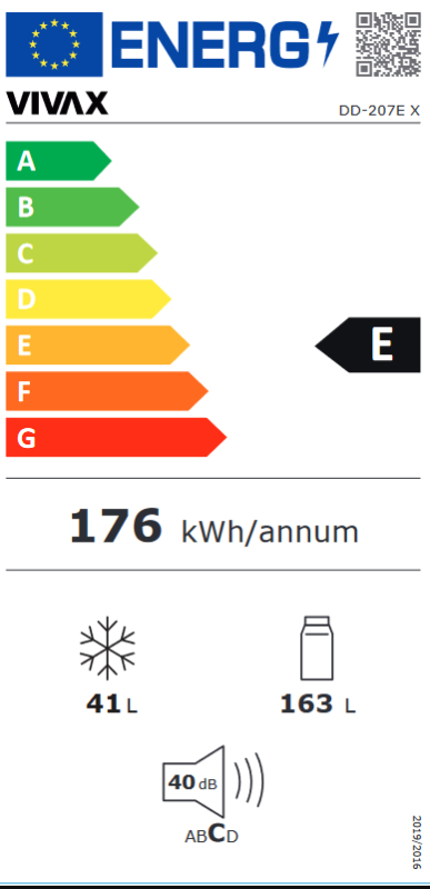 Sa godišnjom potrošnjom energije od samo 176 kWh, VIVAX DD-207E X se svrstava u energetski razred E, što doprinosi smanjenju troškova električne energije. Ovaj frižider je idealan za one koji žele da uštede na računima za struju bez kompromisa na performansama.