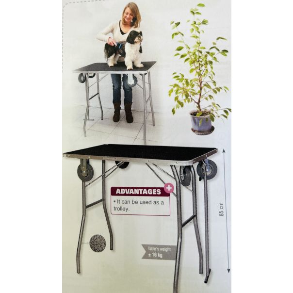 Dimenzije -ploča stola 90 cm x 55 cm. Visina stola 85 cm. Površina stola neklizajuća. 4 točka, jedna podesiva vučna šipka 70<120 cm) kako bi imao i funkciju kolica