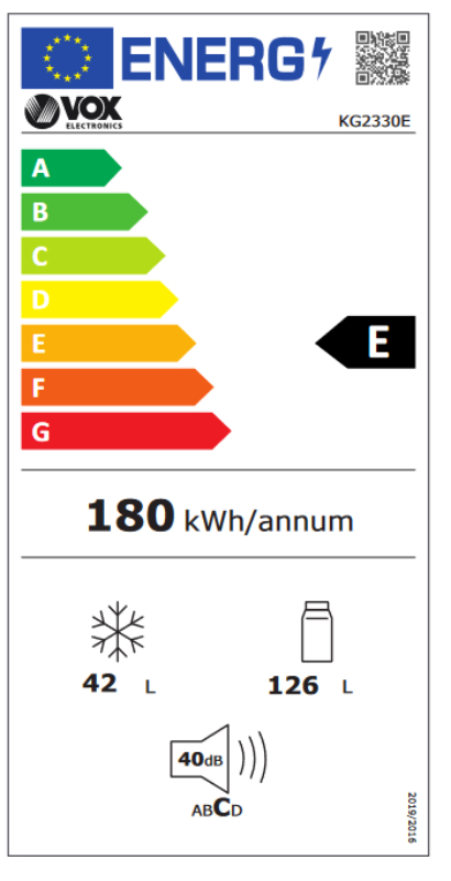 Ovaj model pripada energetskom razredu E, sa godišnjom potrošnjom električne energije od 180 kWh. To ga čini ekonomičnim izborom za domaćinstva koja žele da smanje troškove električne energije.