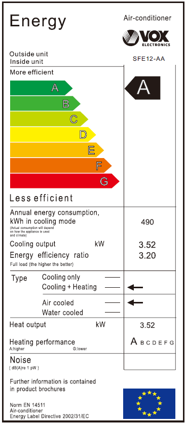 VOX Standardni klima uređaj SFE12-AA dolazi sa energetskom klasom A, što ga čini izuzetno efikasnim u potrošnji energije. Sa kapacitetom grejanja i hlađenja od 3520 W, ovaj uređaj je idealan za održavanje optimalne temperature u vašem domu tokom cele godine.