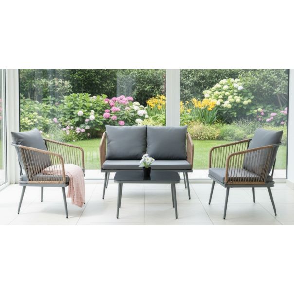 Čelična konstrukcija obezbeđuje stabilnost i dugotrajnost, dok ručno pleteni 4 mm okrugli ratan pruža otpornost na vremenske uslove i UV zračenje. Udobni jastuci debljine 5 cm, izrađeni od 180 g poliestera, lako se održavaju i pružaju dodatnu mekoću. Ispod jastuka se nalaze čelične letvice za bolju potporu sedištu, dok sto dolazi sa 4 mm staklenom pločom koja je moderna, elegantna i laka za čišćenje.